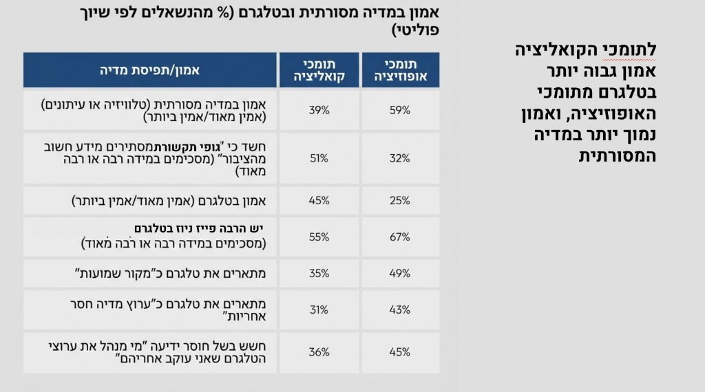 פער ברור עלה בתפיסות בין המחנות הפוליטיים: ל-59% מתומכי האופוזיציה יש אמון במדיה המסורתית לעומת 39% בלבד מתומכי הקואליציה. מנגד, ל-45% מתומכי הקואליציה יש אמון בטלגרם לעומת 25% בלבד בקרב תומכי האופוזיציה. כמו כן, 51% מתומכי הקואליציה חושדים כי התקשורת הממסדית מסתירה מידע חשוב מהציבור, לעומת 32% מהאופוזיציה. "תגידי למי את מצביעה ואני אגיד מה את חושבת על התקשורת הממוסדת", מגדירה זאת אורפז.