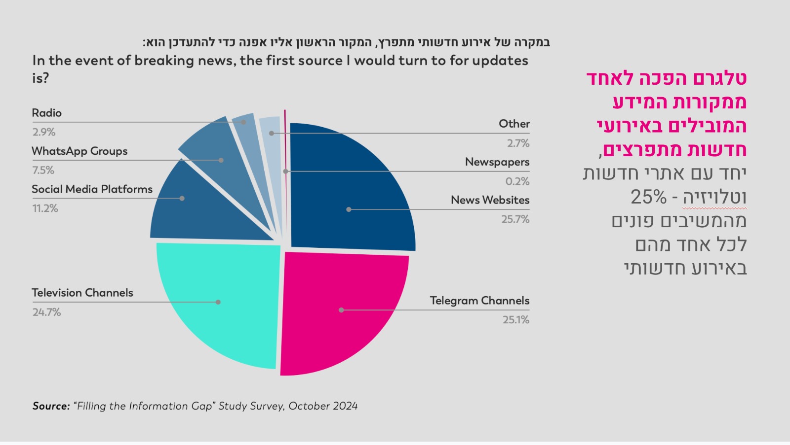 הסקר העלה כי טלגרם הפכה לאחד ממקורות המידע המובילים באירועים מתפרצים: 25% מהמשיבים פונים אליה באירוע חדשותי, שיעור זהה לפנייה לאתרי החדשות ולטלוויזיה. כשני שלישים מהמשיבים משתמשים בטלגרם, ושליש מהם הצטרפו רק לאחר פרוץ המלחמה. יותר ממחצית מהמשתמשים צורכים בה חדשות, בעיקר דרך ערוצים אנונימיים או ערוצים של עיתונאים מוכרים. עם זאת, 37% מהמשיבים מוטרדים מהאנונימיות של מפעילי ערוצי טלגרם.
