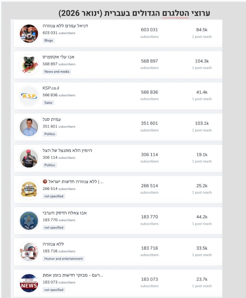 אחרי כל אחד מעשרת ערוצי הטלגרם הגדולים ביותר בישראל, נכון לינואר 2026, עוקבים יותר מ-180 אלף איש. לערוץ "דניאל עמרם ללא צנזורה" יש 603 אלף עוקבים ולאבו עלי אקספרס, ששומר על אלמוניותו, יש 568 אלף עוקבים. כל הערוצים, מלבד זה של KSP שמפרסם קופונים ומבצעים, הם ערוצים חדשותיים, כאשר היחיד מתוכם שהוא עיתונאי בכלי תקשורת מסורתי הוא עמית סגל, הפרשן הפוליטי של חדשות 12.