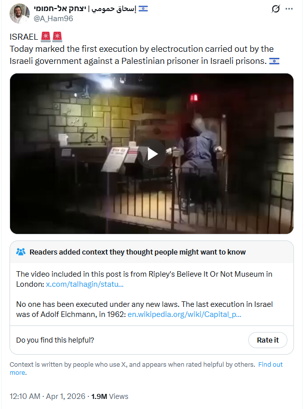ציוץ נוסף שעלה לכותרות כעת בזכות הפרכתו, קשור דווקא לאיתמר בן גביר. לאחר שאושר חוק עונש מוות למחבלים, סרטון ובו נראה כיסא חשמלי נחשף אצל אל-חמומי לכמעט 2 מיליון משתמשים, זאת למרות שמדובר בכלל במיצג מוזיאוני של Ripleys Believe It Or Not Museum בלונדון. רק אתמול פורסמה ב-AFP מקסיקו כתבה ובה נכתב כי הסרטון הוא פייק, וכי לא הייתה הוצאה להורג בכיסא חשמלי בישראל.