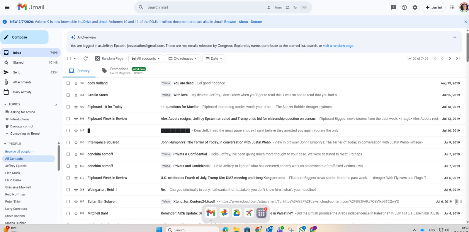 בינואר 2026 שוחררו לציבור יותר מ-20,000 מיילים של ג'פרי אפשטיין, חלק מ-3 מיליון מסמכים בסך הכול, שפורסמו על ידי ועדת הפיקוח של בית הנבחרים האמריקאים. המפתחים לוק איגל וריילי וולץ לקחו את המיילים ויצרו אתר בשם Jmail (ה-J בגלל ג'פרי), שנראה בדיוק כמו ג'ימייל, ומאפשר לכם לחפש לפי מילות מפתח בין עשרות אלפי המיילים השונים. האתר כולל גם קיצור דרך המאפשר לעבור בלחיצה אחת מ-Jmail להעתק של מסמכי המקור באתר הממשלתי, כדי שניתן יהיה לאמת את הטקסט באופן עצמאי.