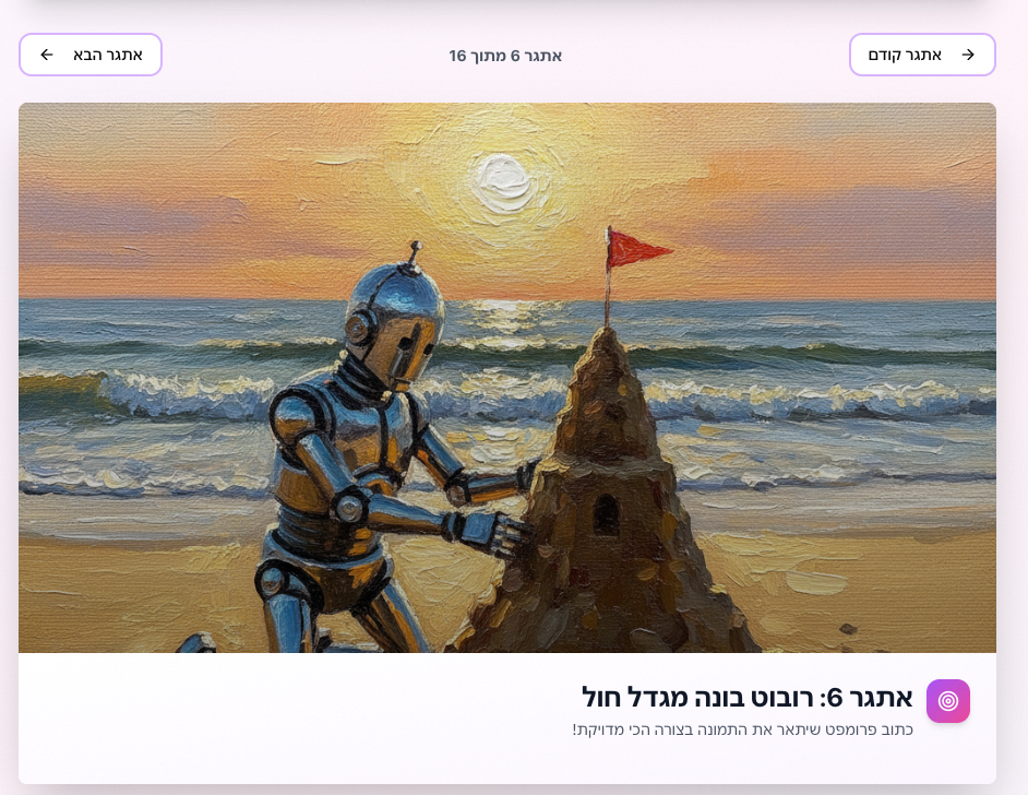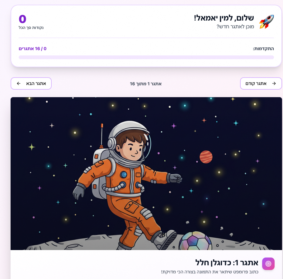 "המשחק מורכב מאתגרים", היא מסבירה. "בכל שלב מקבלים תמונה, למשל כדורגלן מצויר על החלל, וצריך לנחש את הפרומפט המדויק שיצר אותה. לאחר הניסיון מקבלים משוב - מה היה טוב ומה טעון שיפור, ומגלים מה היה הפרומפט המקורי, כל זאת כדי להפוך למאסטרים".