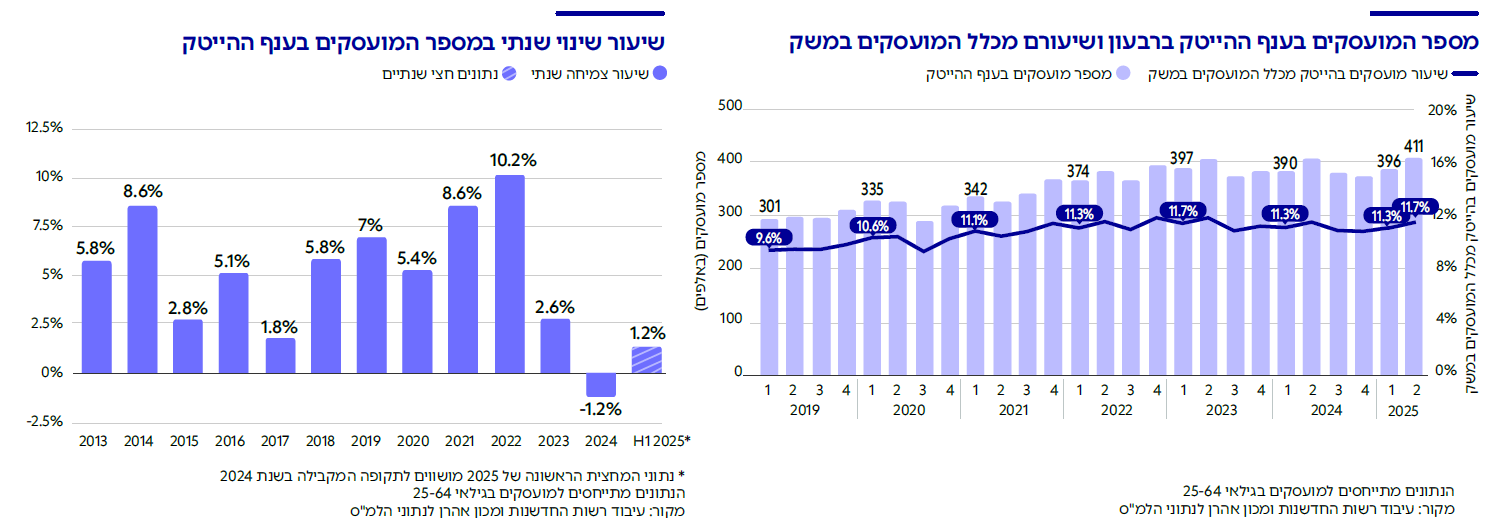 גם לפי דוח רשות החדשנות, יש קיפאון במספר המועסקים בהייטק. על פי הדוח, במחצית הראשונה של 2025 הועסקו בענף כ-403 אלף עובדים, 11.5% מכלל המועסקים במשק. המספר מגלם עליה קלה לעומת שנת 2024, אז הועסקו בענף 391 אלף איש, אולם מספר המועסקים בתפקידי מחקר ופיתוח ירד ב-6.5% לעומת התקופה המקבילה אשתקד.