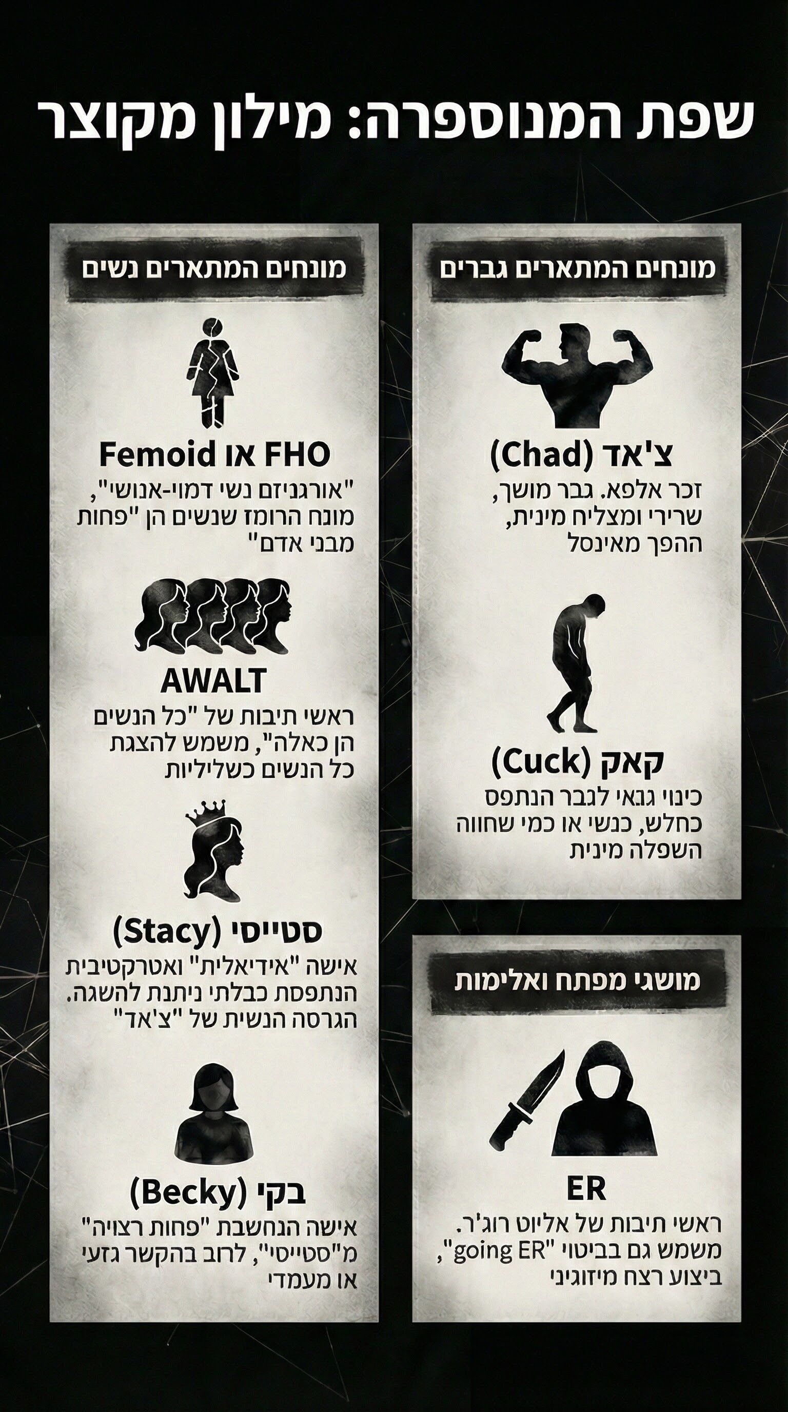 למדינת ישראל יש אולי רקורד נקי ממה שנקרא טרור אינסלי, אבל יש לה גם גיליון הרשעות עקוב מדם של אלימות כלפינשים. אחרי שנתיים של מלחמה, יש בה גם הרבה מאוד גברים צעירים עם נפש פצועה שמרגישים ש"אף אחד לא מבין אותי" – סנטימנט שמוזכר שוב ושוב בהקשר של פוסט-טראומה צבאית, וגם – להבדיל המון הבדלות – בהקשר של אותה תחושת בדידות ששולחת גברים צעירים לחפש תשובות במקומות הלא נכונים. ובעוד שהבריטים מלמדים בבתי ספר איך להיזהר מהחרא הזה, בארץ אפילו לא שמעו על המנוספרה.
