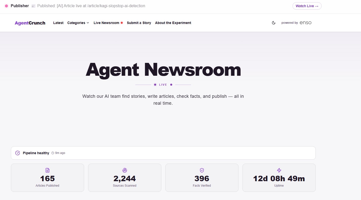 אתר הטכנולוגיה AgentCrunch.ai, שבנה מיקי חסלבסקי, מנכ"ל Enso, הוא ניסוי ראשון מסוגו לדבריו של מערכת עיתונאית המנוהלת על ידי שישה סוכני AI, ללא מגע יד אדם. האתר, שכבר רשם מאות אלפי כניסות, מדגים כיצד סוכנים אוטונומיים מבצעים תחקיר, כתיבה ובדיקת עובדות מסביב לשעון