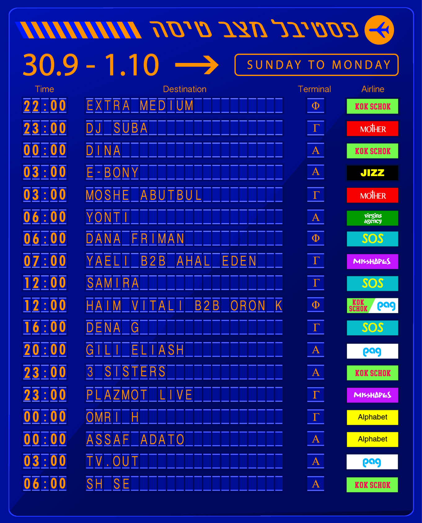 הפסטיבל מתחיל ביום ראשון ב-22:00 ב״פיי״. ב-23:00 ייפתח ה״גמא״ ואז ב-00:00 ייפתח ה״אלפאבית״. ב״פיי״ תהיה רחבה אלטרנטיבית עם הופעות, ה״גמא״ יהיה חדר האוס וה״אלפא״ יהיה חדר טכנו. פרטים נוספים בפייסבוק.