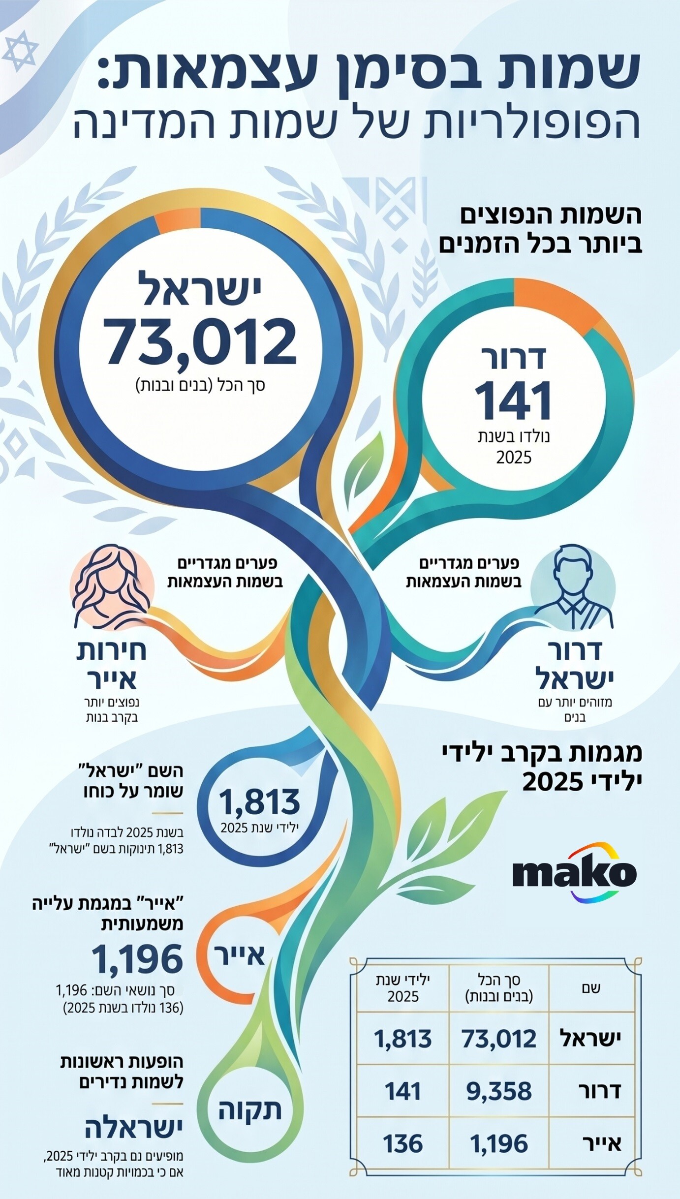 השם ישראל נישא עד היום בידי כמעט 73 אלף אזרחים ואזרחיות, השם מדינה הוענק ל-233 בנות, והשם ניצחון שמור לשלושה בנים בלבד. הנתונים, שמפרסמת רשות האוכלוסין וההגירה לקראת יום העצמאות, חושפים פערים עצומים בפופולריות של שמות העצמאות, הכוללים בין היתר את תקווה, חירות, דרור, עצמאות וישראל.