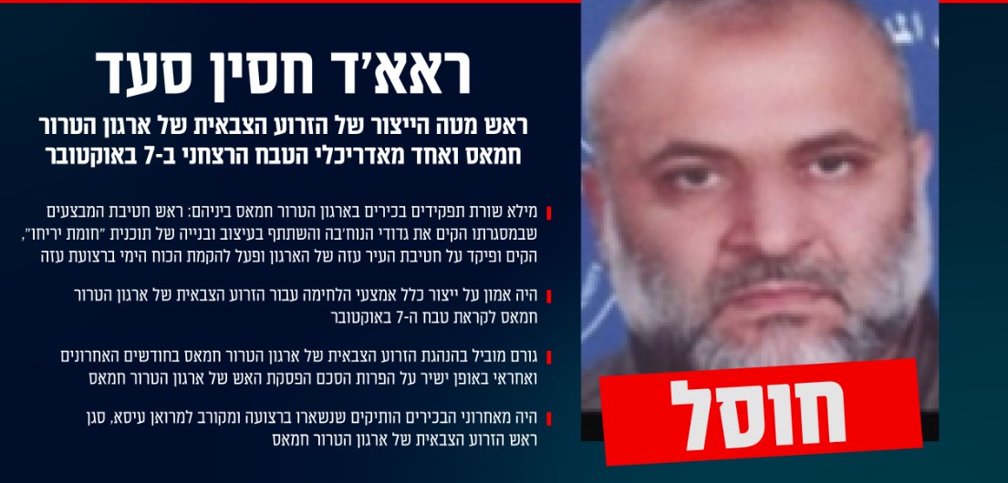דובר צה"ל ודוברות שב"כ מודיעים הערב (מוצ"ש) כי תקפו וחיסלו את ראש מטה הייצור של הזרוע הצבאית בארגון הטרור חמאס ואחד מאדריכלי טבח 7 באוקטובר, ראאד חסין סעד, אחד משני הבכירים ביותר בזרוע הצבאית של חמאס ברצועת עזה שעוד נותרו אחרי המלחמה, יחד עם עז א-דין אל-חדאד.