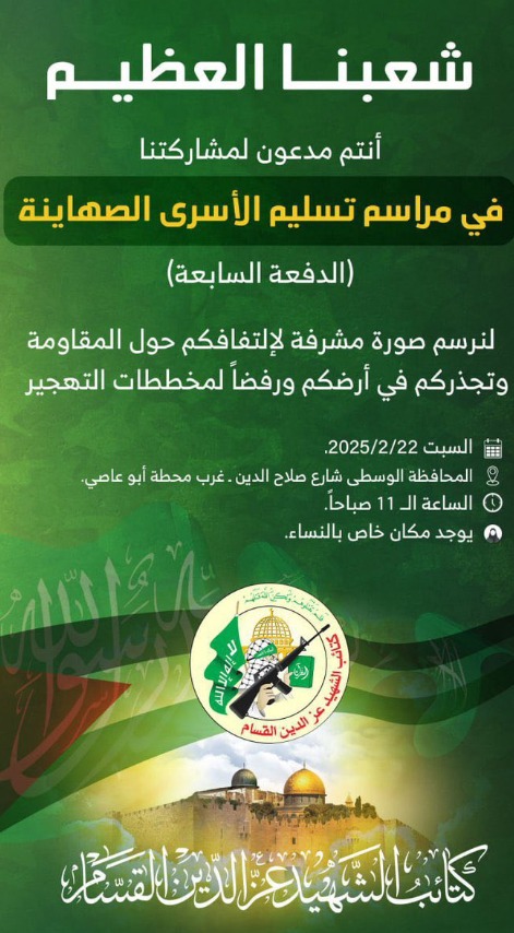 "אתם מוזמנים להשתתף בטקס מסירת האסירים הציוניים (השליחה השביעית)", נכתב באותה הזמנה, "לצייר תמונה משותפת להסכמתכם לגבי ההתנגדות ולתמוך בסירובכם למזימות ההתפשטות", כשהכוונה לתוכנית טראמפ לפינוי הרצועה. על ההזמנות נכתב גם תאריך, שעה ממש כפי שמזמינים לאירוע על אף שמדובר באירוע מזעזע ולא לגיטימי כשכזה.
