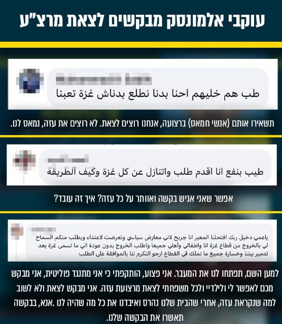 מתאם פעולות הממשלה בשטחים, אלוף רסאן עליאן, בפנייה לתושבים בעמוד הפייסבוק: "אנחנו שומעים אתכם ויודעים שיש מי מכם שרוצים לעזוב את רצועת עזה. אתם כותבים לנו על כך בתגובות ובהודעות פרטיות בדף אלמונסק. כך למשל, בעקבות הפרסום שלנו מתחילת השבוע על בכירי חמאס שבורחים מהרצועה ומשתמשים בכם שוב כמגן אנושי, רבים מכם כתבתם בתגובה על רצונכם לעזוב את הרצועה. ברצוננו להבהיר: שגרירויות רבות בעולם פונות בשמכם ומבקשות לקלוט אתכם במדינתן. אנחנו נמשיך לתאם פינויים נוספים לבקשת השגרירויות. הפינוי יתבצע בכפוף לקבלת בקשה משגרירות של המדינה הקולטת".