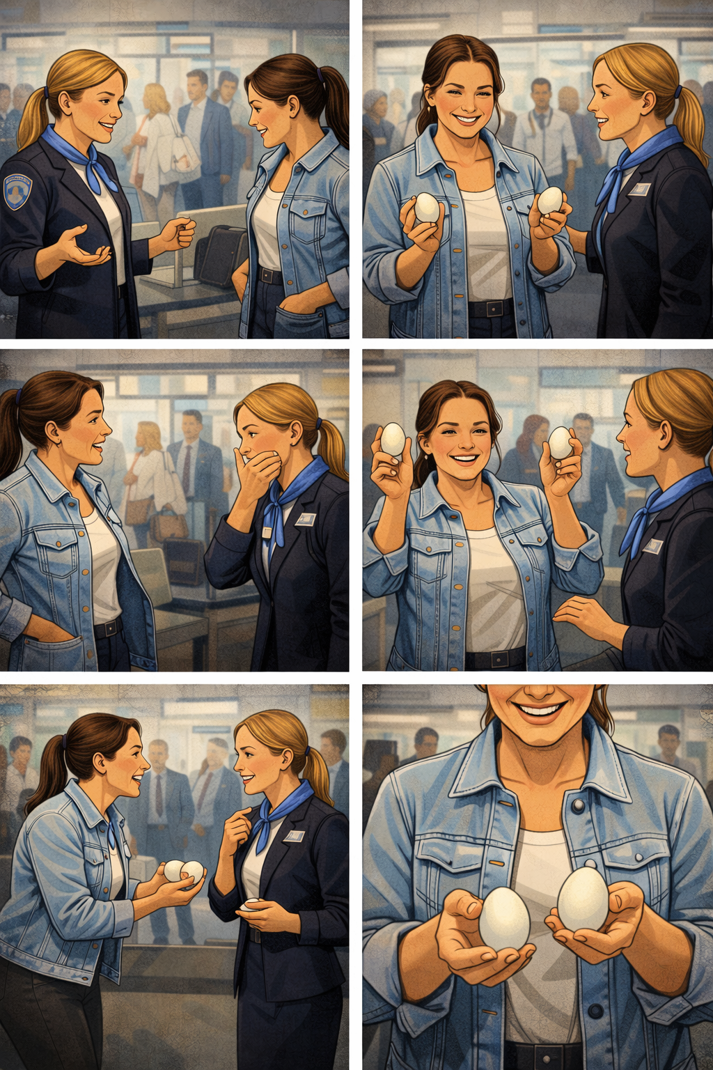 כשעבדתי בנתב"ג יום אחד הייתה לי משמשרת ממש גרועה. באה איזו מישהי ושאלתי אותה אם יש לה משהו בכיסים והיא כי ראיתי משהו בולט. אז היא אמרה לי באנגלית שיש לה "רק שתי ביצים". הסתכלתי עליה בבלבול ופתאום היא הוציאה שתי ביצים קשות מהכיסים וחייכה אליי. זה עשה לי את היום ואני אזכור אותה לנצח. מי שם ביצה קשה בכיס? ממש צחקתי ואז הרגשתי לא נעים ממנה כי היא הייתה נורא גאה בביצים שלה.