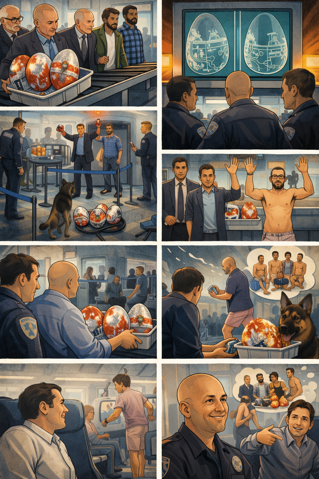 אבא שלי טס לנסיעת עבודה באמסטרדם עם שלושה חברים כמה חודשים אחרי אסון התאומים. בתקופה הזאת באופן טבעי היה טירוף בשדות התעופה והרבה חשדות בעיקר כלפי ערבים, יהודים, טסים לישראל ומה שביניהם. זו הייתה התקופה של חנוכה וכריסמס, אז היו בזמנו ביצי הפתעה ענקיות כאלה במיוחד לחג וכל אחד מהחברים קנה לילדים שלו. בגלל שזה היה מאוד שביר, הם טסו איתם בשקית אישית וכשהגיעו לבידוק הבטחוני, הם העבירו את הביצים בשיקוף ופתאום תוך דקות כל האיזור התמלא מאבטחים. פינו את כולם, תחמו את האיזור עם גדרות ולקחו אותם לחדר לתשאול (חשוב לציין גם שהם טסו עם חבר ערבי בשם מוחמד).