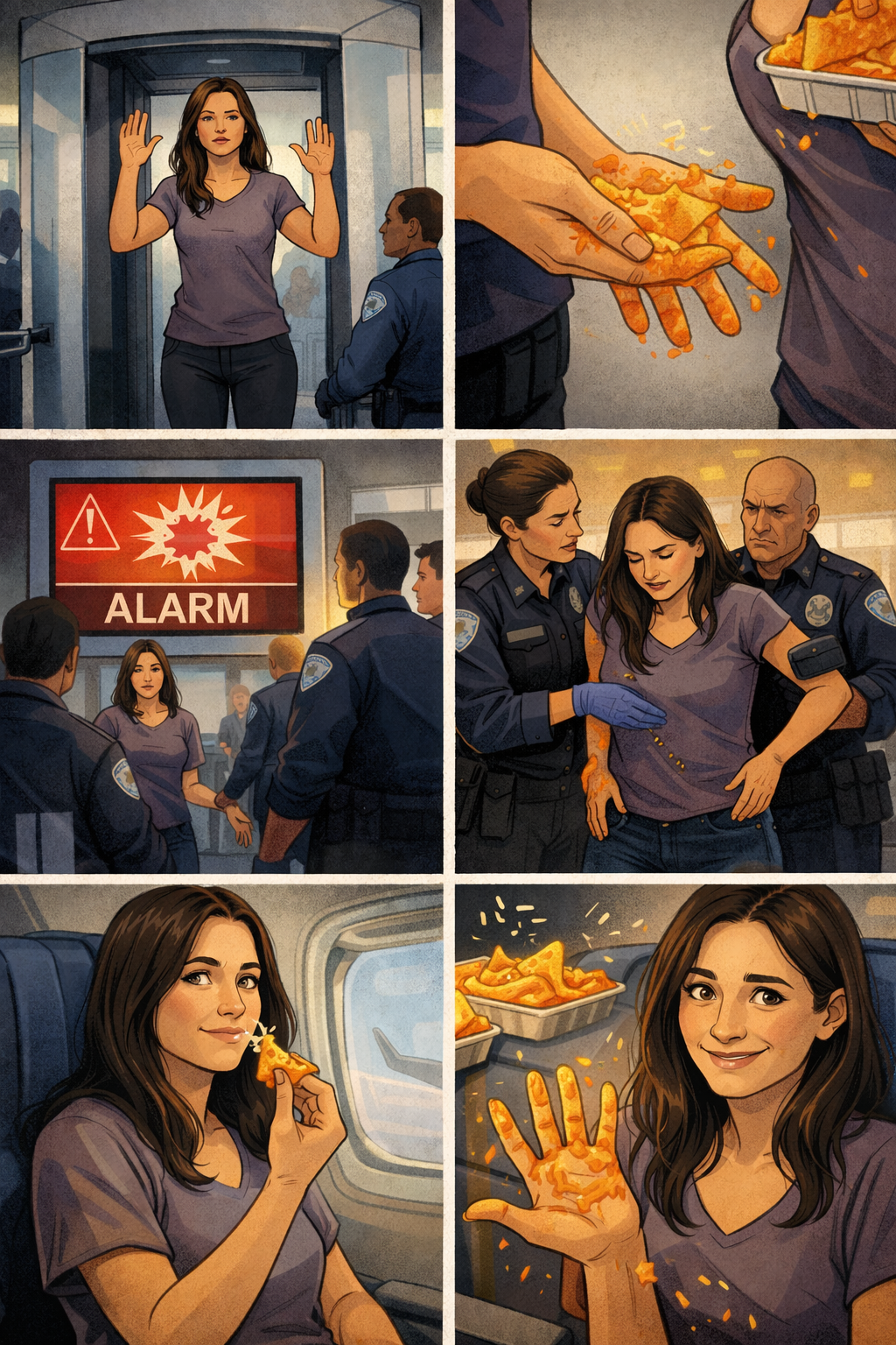 כשטסתי ממקסיקו לניו יורק, עברתי בבידוק הביטחוני בשער שסורק את הגוף. בדרך כלל אני רגילה שהכל עובר תקין, אבל ביקשו ממני הפעם לבוא הצידה. העבירו לי מטלית קטנה על האצבעות, לקחו ושמו אותה במכונה כזאת שהתחילה לצפצף. הסתכלתי על המסך וראיתי שכתוב באנגלית: "חומרי נפץ אותרו". משם לקחו אותי לחדר צדדי ועשו לי בדיקה גופנית ואחרי החרדה הזאת הניחו לי ונתנו לי להמשיך לטיסה. אין לי מושג למה זה קרה, הניחוש שלי שזה בגלל נאצ'וס דביקים במיוחד שאכלתי בדרך לשם.