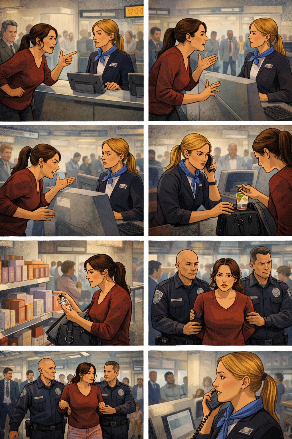 הגיעה אליי מישהי לעשות צ'ק אין לטיסה, מישהי שהיה ברור שהיא קמה בבוקר עם צורך לריב על כל דבר. השעה 12:00 בצהריים, אני מתקרבת לשתיים עשרה שעות של משמרת. הבחורה מחליטה שהיא רוצה לריב איתי על הכל, החל מהאורך של התור, המושב שלה בטיסה ליד החלון כשהיא רוצה לשבת במעבר, ועד שעת ההמראה שהייתה מוקדמת בשבילה וזה לא נוח לה. אחרי עשר דקות מייגעות היא סוף סוף עוזבת אותי וממשיכה בדרכה לדיוטי פרי. אחרי ארבעים דקות, אני מקבלת שיחה מאחראית הטיסה ששואלת אותי אם אני ביצעתי לה צ'ק אין. מסתבר שהנוסעת הזאת נתפסה גונבת בדיוטי פרי והורידו אותה מהטיסה בליווי משטרתי.