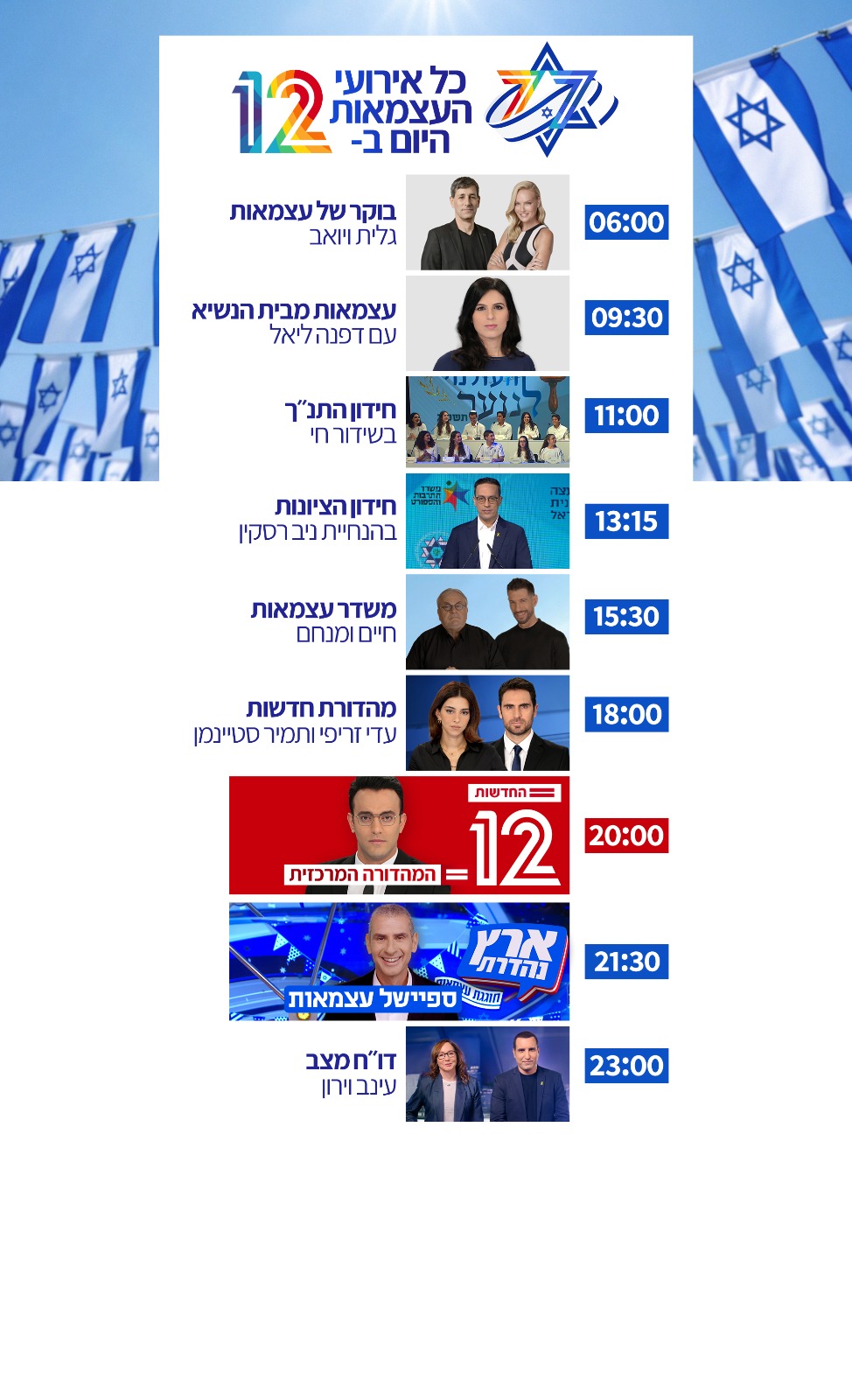 כבכל שנה, גם הפעם ישודר בערב יום העצמאות משדר "הכוכבים של צה"ל בסימן הוקרה לפצועים ולמערך התומך". את האירוע בערוץ 12 יוביל עידן רייכל, ולצדו ישירו חיילים וחיילות שנפצעו, וגם אלו שמלווים ועומדים לצדם. גם משתתף "בית ספר למוזיקה" אברהם דהאן, שנפגע השנה קשה מטיל נ"ט בקרבות ברצועת עזה, ישיר לצד היוצר: "אין דברים כאלה, מעמד מאוד מרגש"