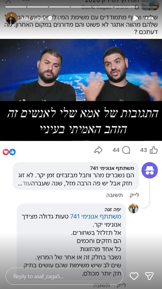 אסף זגה ושלומי יפרח הם בין הזוגות הבולטים ב"המירוץ למיליון", למרות שלא כל המשימות הולכות להם בקלות. לאחר שנקלעו למשבר במשימת האופניים בהונג קונג, השניים ספגו ביקורות ברשת. מי שהחליטה לצאת להגנתם היא אמו של אסף שהשיבה למשתמש אנונימי שביקר אותם: "אל תזלזל"