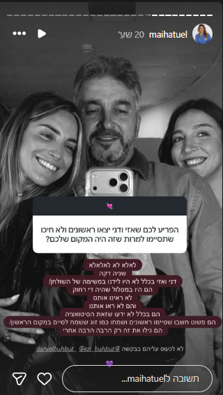 דני ממשיכה ומבהירה את המצב האמיתי במשימה: "היו שם שתי מדשאות, אנחנו לא ראינו אותם אפילו עושים את המשימה הזאת. לא ראינו לרגע שמאי ואיתי סיימו ראשונים ואיתי בא ועזר, לא ראינו את עמרי ואיתי כל כך מתקשים. לא ידענו את כל הדבר הזה שראיתם בפרק. אני ואבא היינו במשימה שהייתה לנו הכי קשה בעולם כמו לכל הזוגות, סיימנו אותה וחשבנו שהיינו ראשונים. יצאנו בהתרגשות מטורפת וכל הקרדיט מגיע לאיתי האלוף הזה ומאי שבחרה יחד איתו לעשות את זה. לא הייתה לנו שום מטרה לצאת זחוחים, פשוט עד שיצא לנו להגיע ראשונים, זה היה כנראה בטיימינג לא טוב".