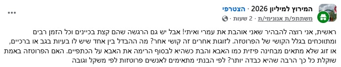 עוד היא הוסיפה: "לזוגות אחרים זה קושי אחר? מה ההבדל בין אחד שיש לו בעיות בגב או ברכיים, או זוג שלא מתאים מבחינה פיזית כמו האבא והבת. האם הפרותזה באמת שוקלת כל כך הרבה שהיא כבדה יותר? לפי הבנתי מתאימים לאנשים פרותזות לפי משקל וגובה".