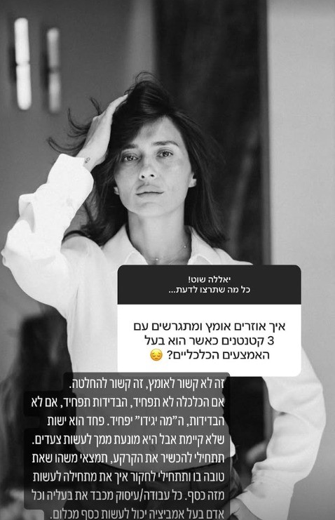 "תתחילי להשקיע בחיזוק המיינדסט שלך, תכיני רשת ביטחון משפחתית, חברתית, נפשית וכלכלית".