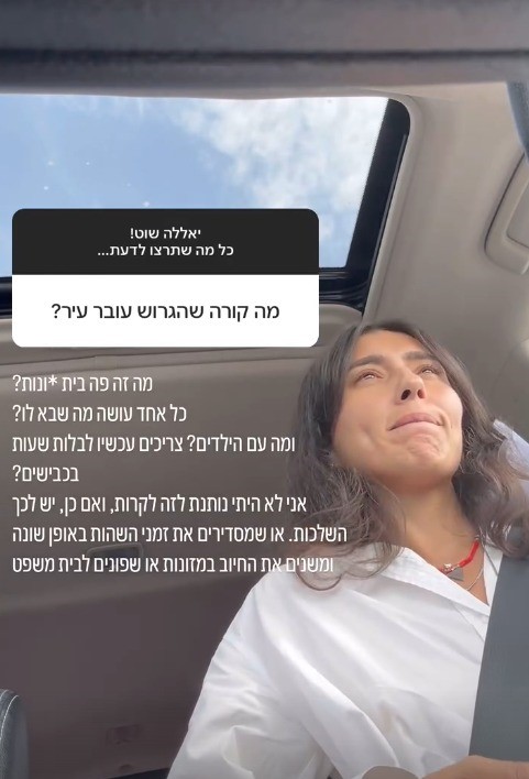 "מה זה פה, בית זונות? כל אחד עושה מה שבא לו? ומה עם הילדים? צריכים עכשיו לבלות שעות בכבישים? אני לא הייתי נותנת לזה לקרות, ואם כן אז יש לכך השלכות - או שמסדירים את זמני השהות באופן שונה ומשנים את החיוב במזונות או שפונים לבית משפט".