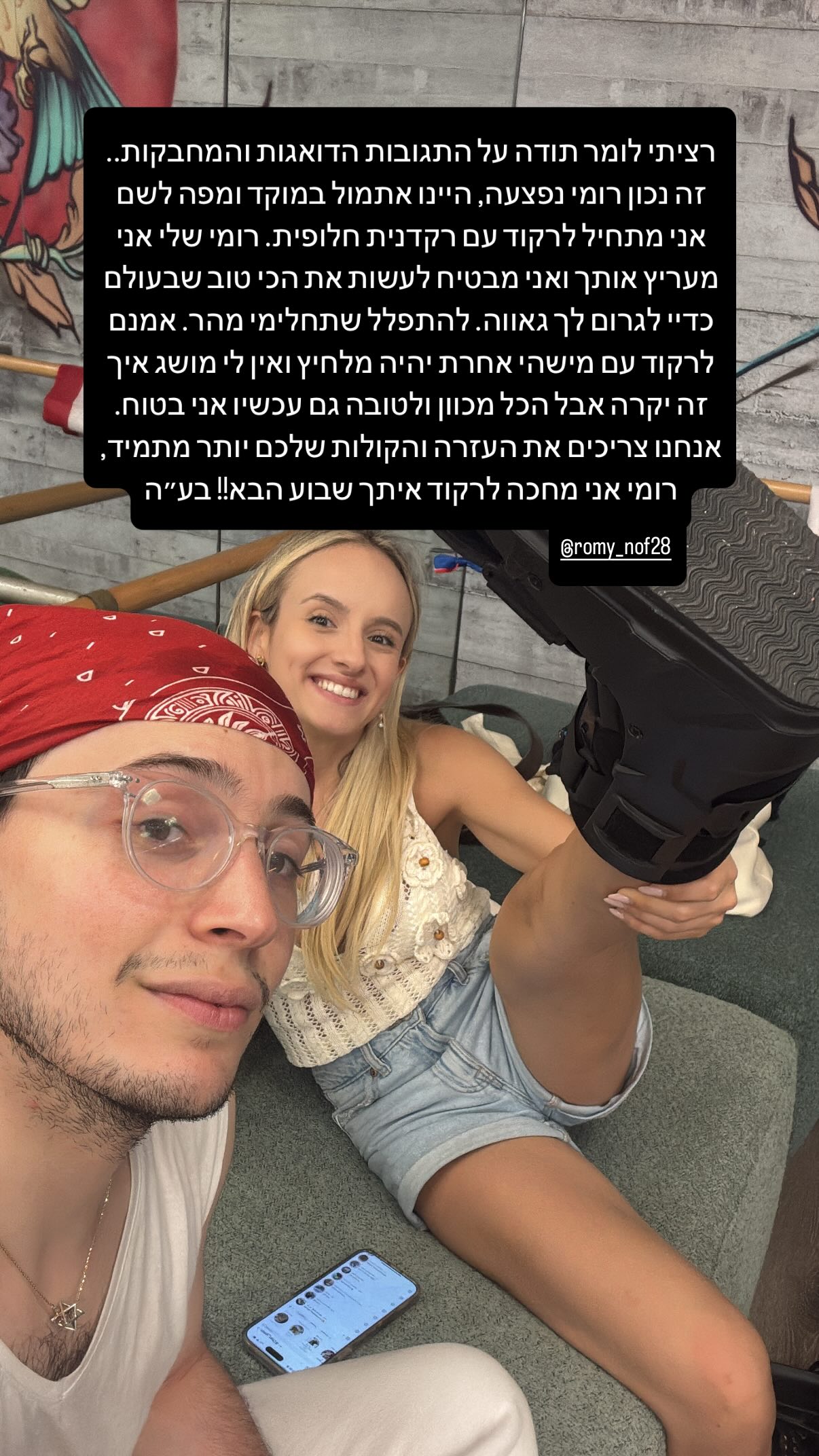 בסטורי שהעלה לחשבון האינסטגרם שלו, טבוך שיתף במצבה של נוף: "רציתי לומר תודה על התגובות הדואגות והמחבקות. זה נכון, רומי נפצעה, היינו אתמול במוקד ומפה לשם אני מתחיל לרקוד עם רקדנית חלופית. רומי שלי, אני מעריץ אותך ואני מבטיח לעשות את הכי טוב שבעולם כדי לגרום לך גאווה. לרקוד עם מישהי אחרת יהיה מלחיץ ואין לי מושג איך זה יקרה, אבל הכל מכוון ולטובה. מחכה לרקוד איתך בשבוע הבא בע"ה".