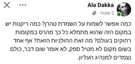 "מה זאת החולניות הזאת?": השחקן והזמר עלא דקה, המוכר בזכות תפקידיו בסדרות "פאודה", "בלאדי מורי" ו"איסט סייד" ובסרטים "תמונת הניצחון" ו"גן קופים" של אבי נשר, פרסם הבוקר (א') פוסט בחשבון הפייסבוק שלו ובו תהה "כמה אפשר לשמוח על השמדת טהרן? כמה ריקנות יש במקום הזה שהוא מתמלא כל כך מהרס במקומות רחוקים בעולם? מה זאת החולניות הזאת?". דקה אף טען כי "אף אחד בשום מקום לא מטיל ספק, לא אומר שום דבר, כולם נצמדים למנהיג העליון".