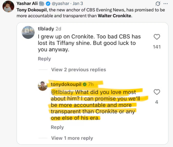 אחד הגולשים איחל לדוקופיל בהצלחה, וציין כי גדל על וולטר קרונקייט - מי שהגיש את מהדורת CBS בין השנים 1962 ל-1981 וכונה לא פעם "האיש האמין ביותר באמריקה". דוקופיל השיב: "אני יכול להבטיח שנהיה יותר אחראיים ויותר שקופים מקרונקייט או מכל אחד אחר מהדור שלו".