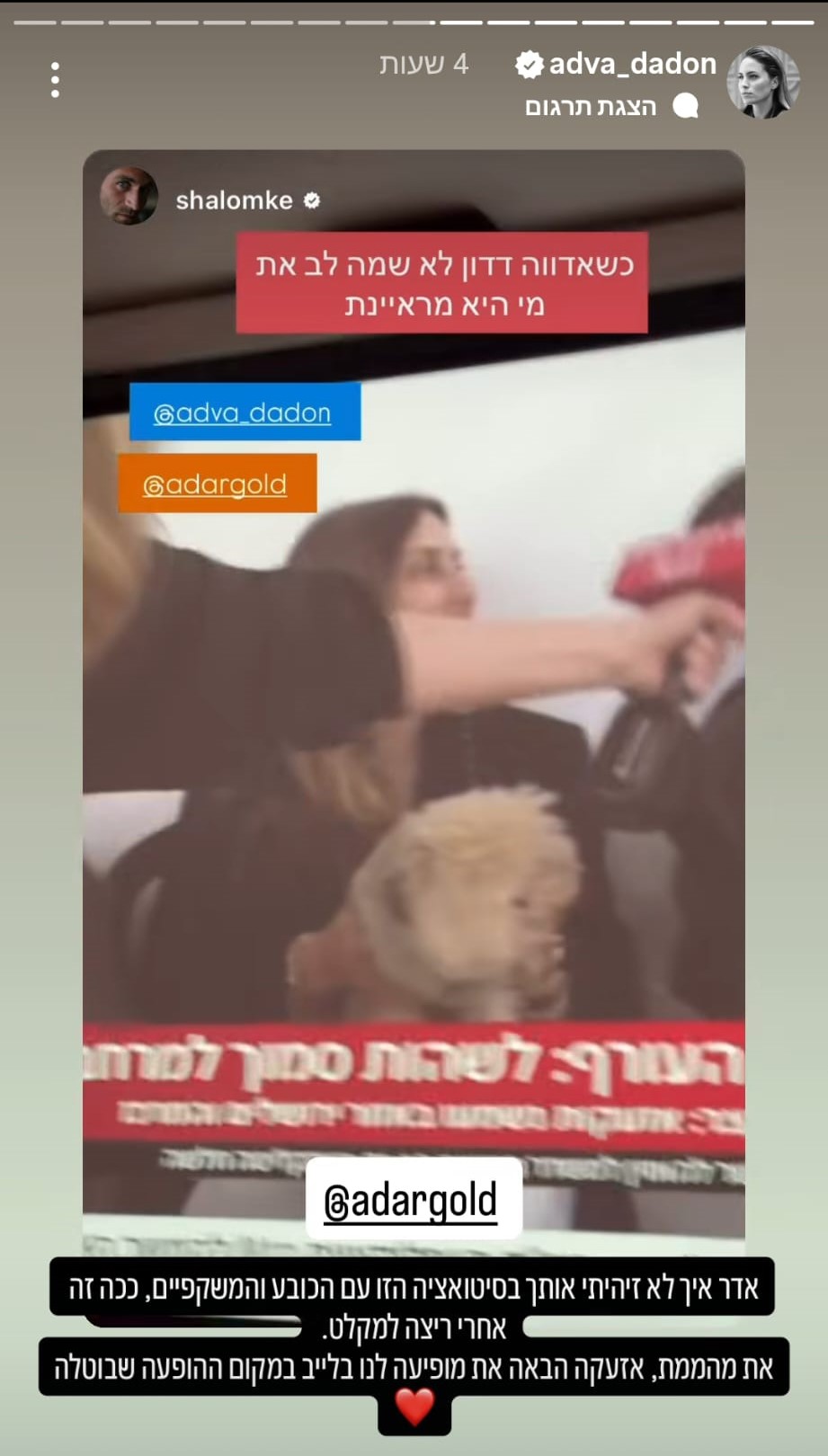 רק אחרי כמה שעות דדון הבינה את מי היא ראיינה, והגיבה על זה בסטורי: "אדר, איך לא זיהיתי אותך בסיטואציה הזו עם הכובע והמשקפיים, ככה זה אחרי ריצה למקלט. את מהממת, אזעקה הבאה את מופיעה לנו בלייב במקום ההופעה שבוטלה".