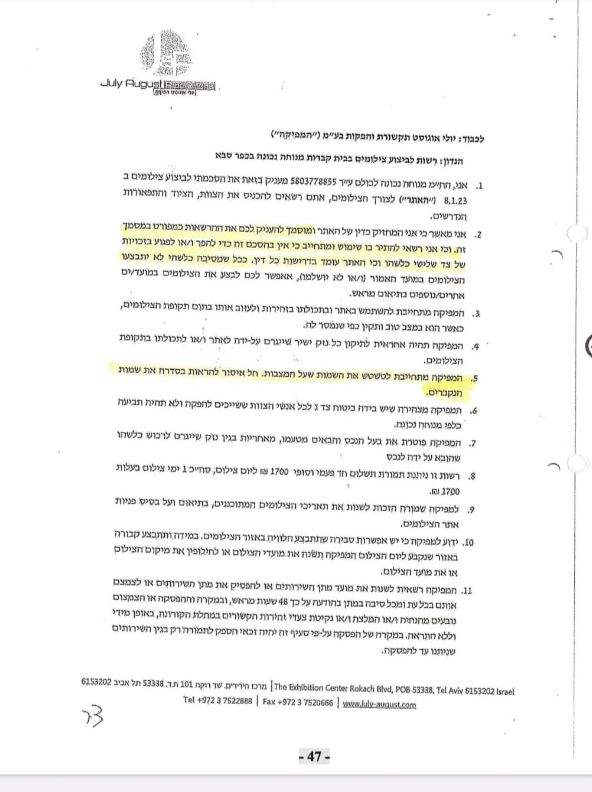 בנוגע לסצנה שצולמה בבית העלמין, נטען כי חברת ההפקות פנתה לעמותה ותרמה 1,700 שקל בתמורה לצילום קבר ריק. "הצד השלישי ('יולי-אוגוסט') לא ביקש, ו'מנוחה נכונה' לא הסכימה, לצלם סצנה ליד קבר של המנוחה שבמרכז התביעה. יותר מכך, הצד השלישי ציין שיצלם בחלקה ריקה הסמוכה לקבר המדובר", הדגישה העמותה. "הצד השלישי שלח צילום של החלקה הריקה, שנמצאת כמה עשרות מטרים מהקבר שבמרכז התביעה".
